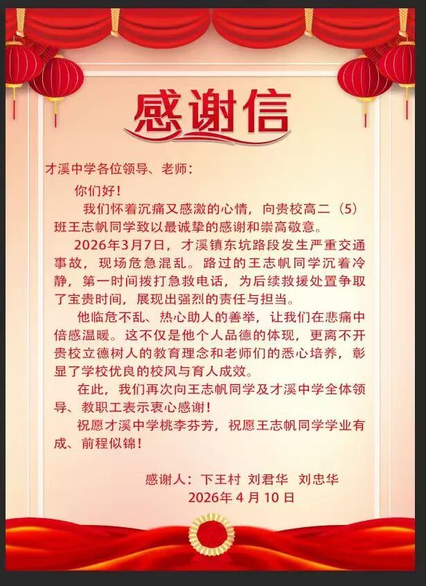 2026年4月13日,上杭县才溪中学升旗仪式现场庄重而温暖。全校师生齐聚操场,为高二(5)班王志帆同学举行表彰仪式,授予其 “见义勇为好少年” 荣誉称号,并颁发奖状及奖金,以表彰他在危急时刻挺身而出、沉着施救的责任与担当。 时间回溯至2026年3月7日,才溪镇东坑路段突发交通事故,现场情况危急、秩序混乱,伤者急需救助。路过此处的王志帆同学没有丝毫犹豫,面对突发状况,他迅速平复情绪,沉着冷静地第一时间拨打急救电话,清晰说明事故地点、人员伤情,为后续救援队伍赶赴现场、开展有效处置争取了宝贵的黄金时间。 这一简单却果断的举动,不仅为伤者救治筑牢了关键基础,更在危难时刻传递出满满的善意与力量。他临危不乱的冷静、热心助人的善举,让身处悲痛中的群众倍感温暖,也成为校园里最鲜活的德育教材。 在此次升旗仪式表彰现场,受助者为王志帆同学颁发奖状与奖金,全校师生报以热烈掌声。学校对王志帆同学的行为给予高度评价,指出他的举动不仅是个人品德的闪光体现,更是才溪中学坚持立德树人、深耕德育育人的实践成果。良好的校风培育出向善向美的学子,平凡的少年用行动诠释了新时代中学生的责任与担当。